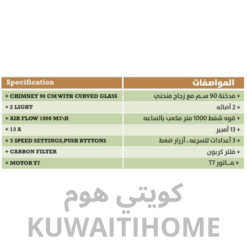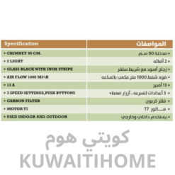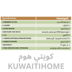 مدخنة 90 سم لون اسود مع قوة 1000 متر مكعب كل ساعة