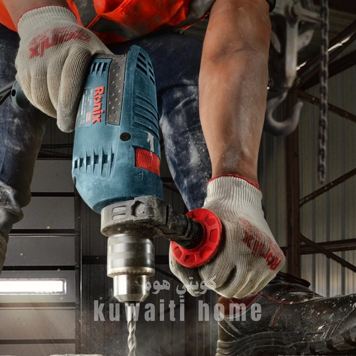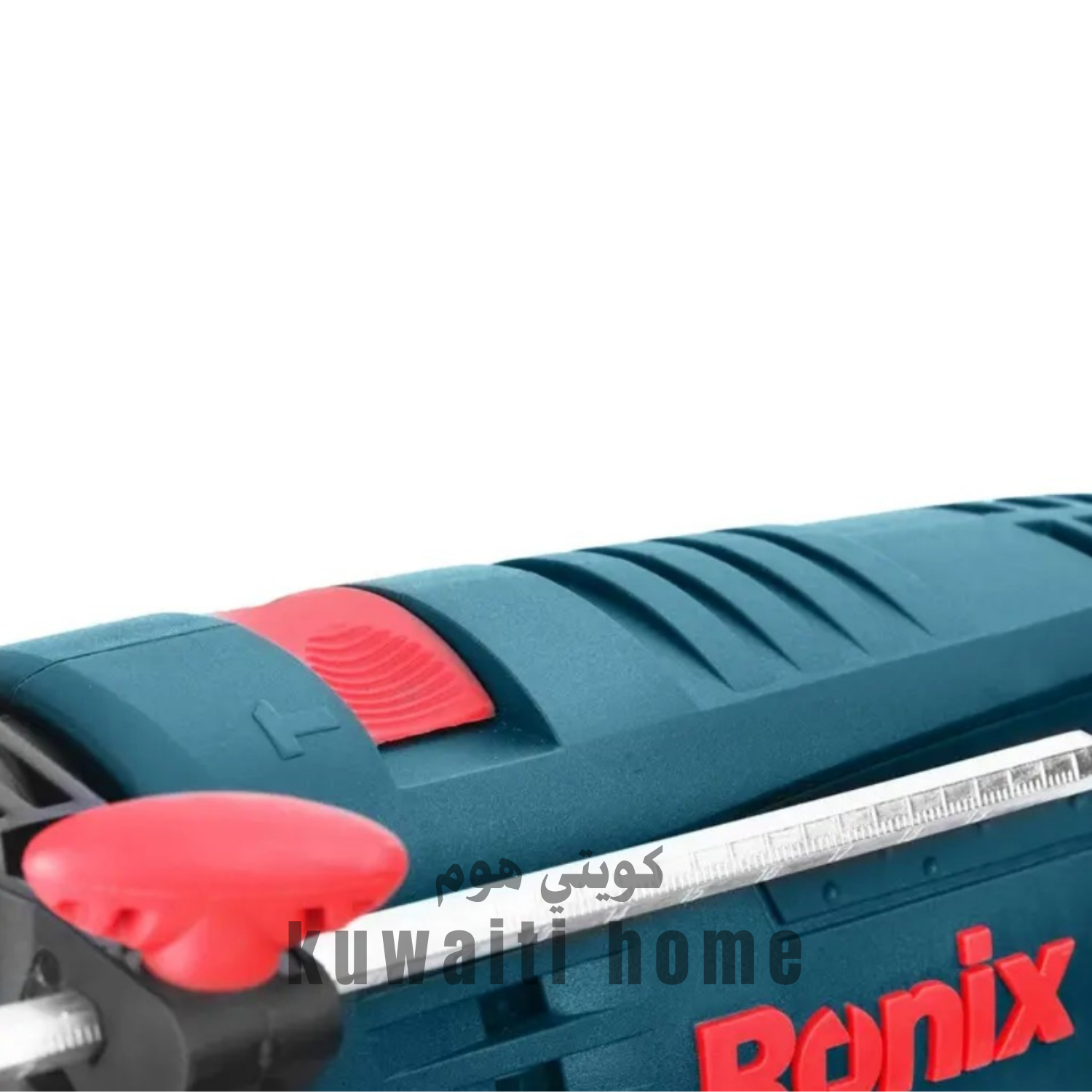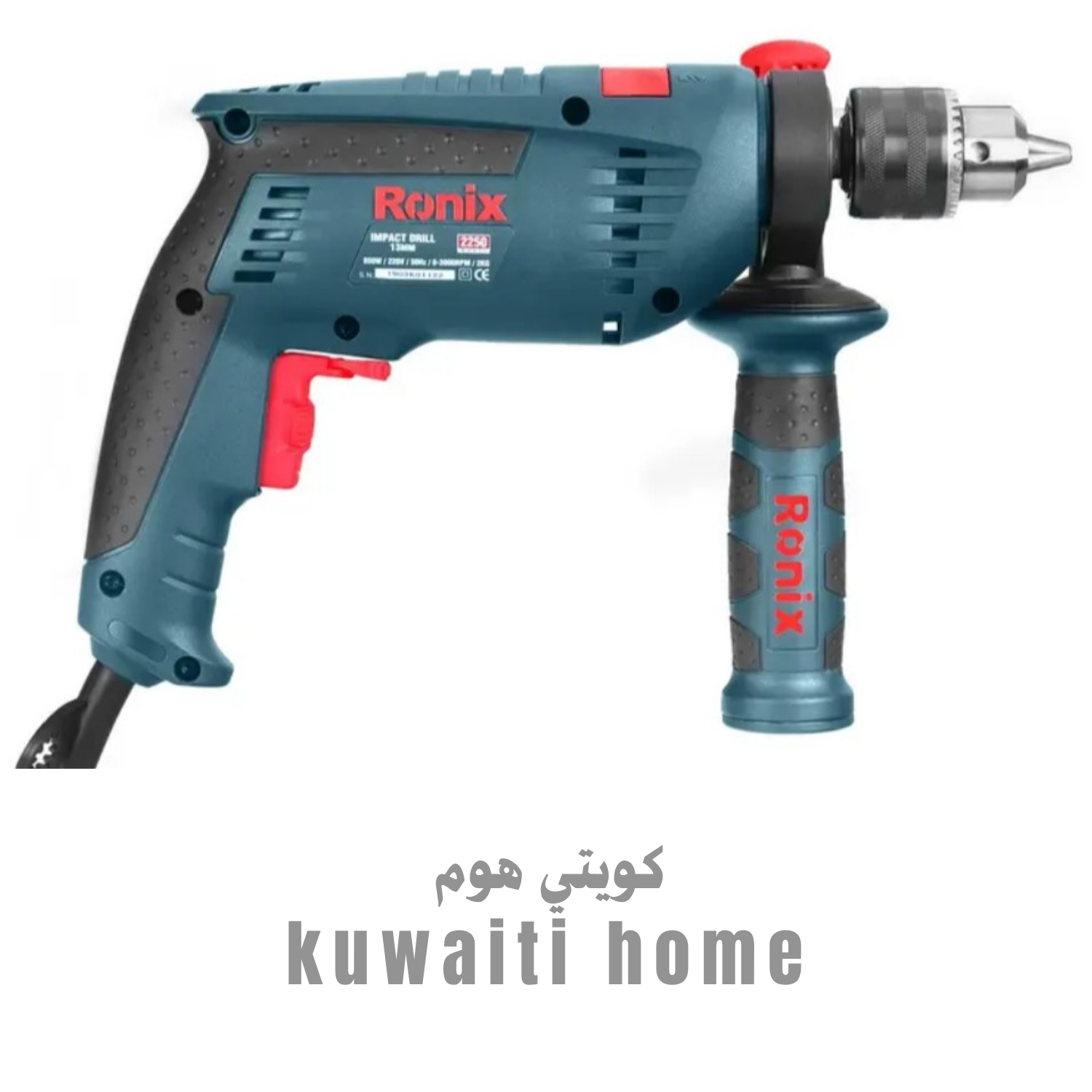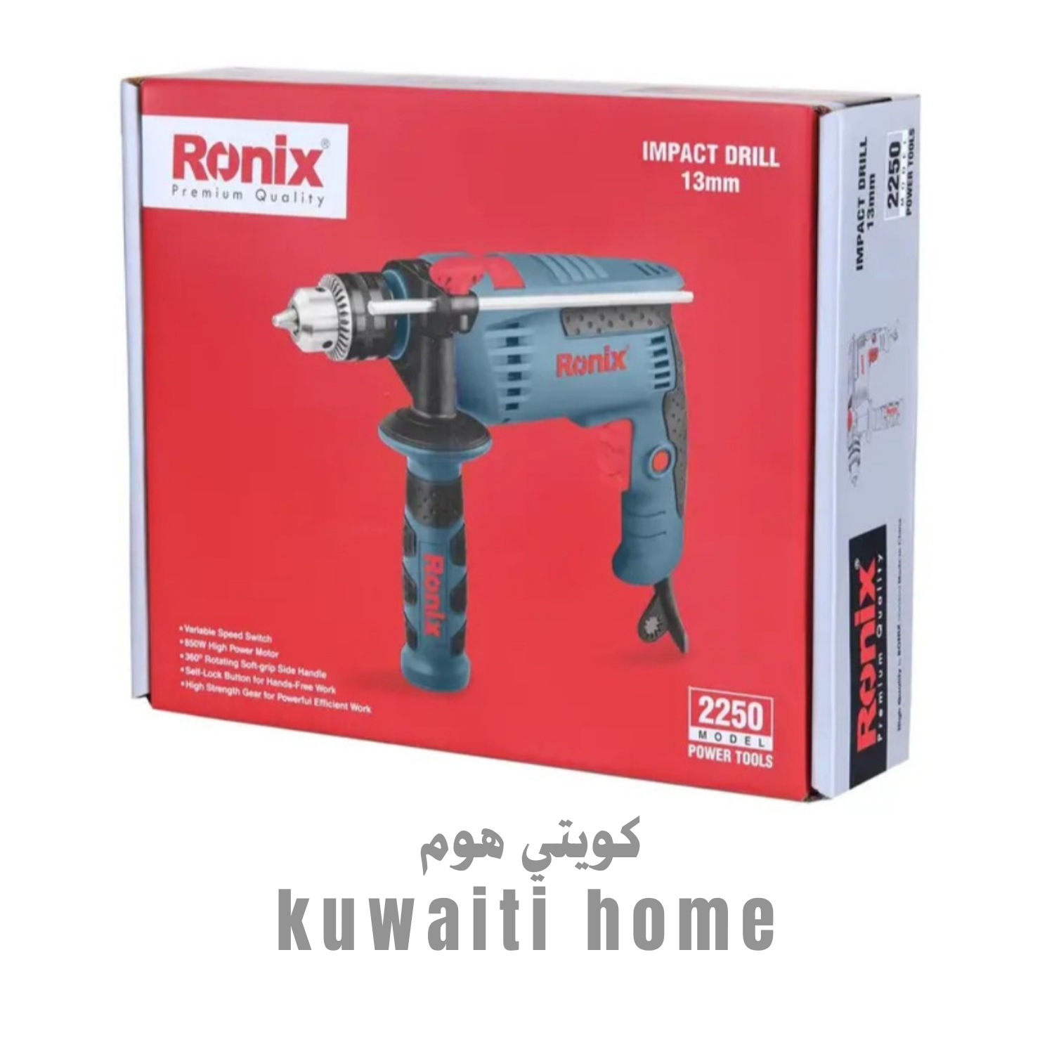 المثقاب المطرقي 2250 مع ظرف بمفتاح 13 ملم من رونيكس، بسعة ثقب 20 ملم في الخشب و13 ملم في المعدن و13 ملم في الخرسانة، بمحرك 850 واط وظرف معدني وأزرار مضادة للغبار ومقبض مريح.